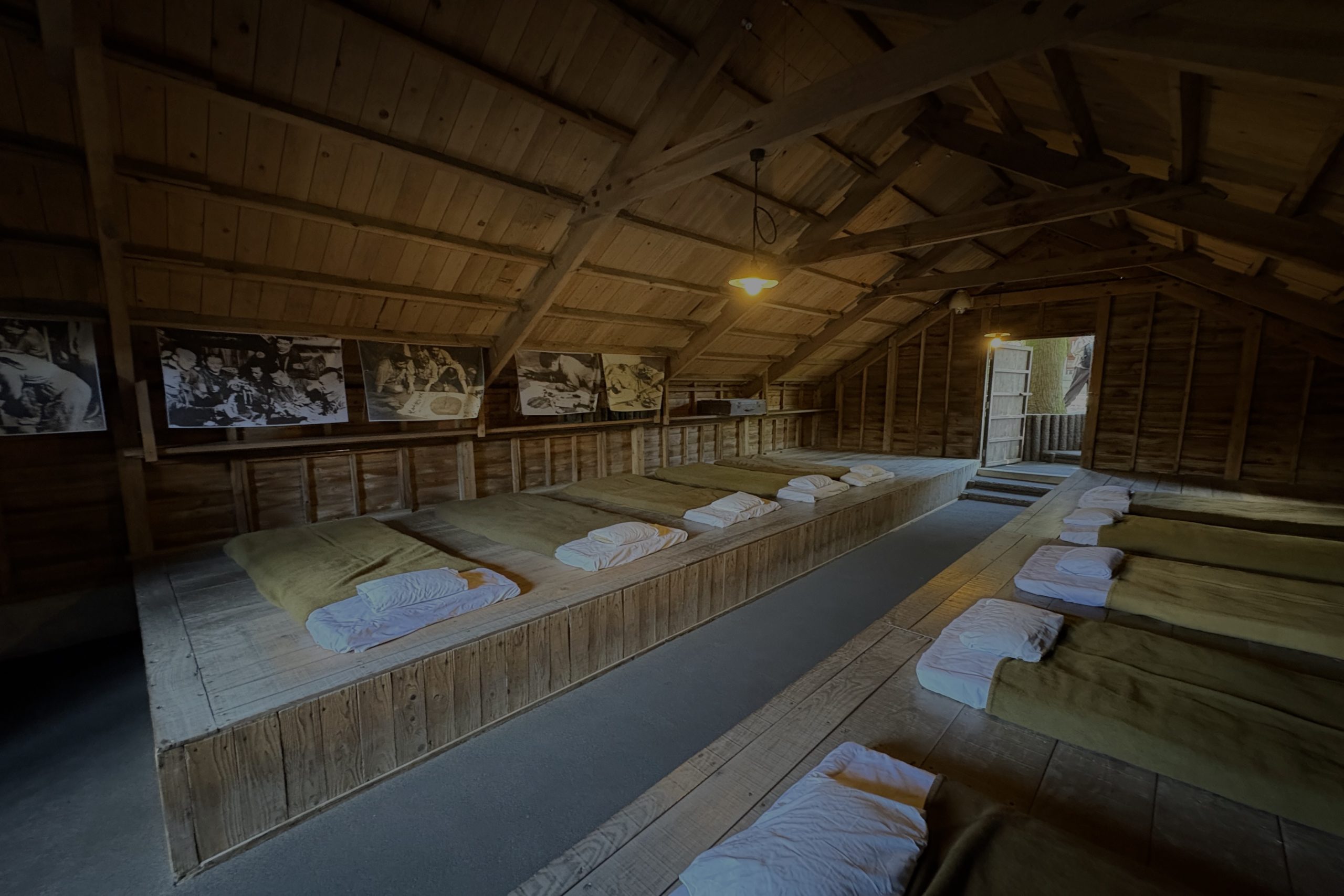 特攻隊員たちが出撃前に寝起していた「三角兵舎」。知覧特攻平和会館で復元されている=2025年8月13日、渡辺周撮影