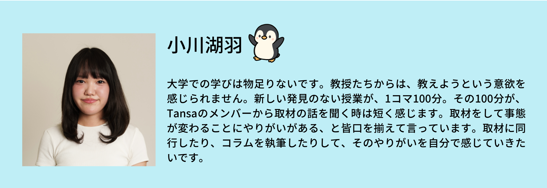 日本には、「絶対に権力に屈しない」と言えるジャーナリストがどれだけいるだろう。私はTansaで学び、自信を持ってそう言えるジャーナリストになりたい。