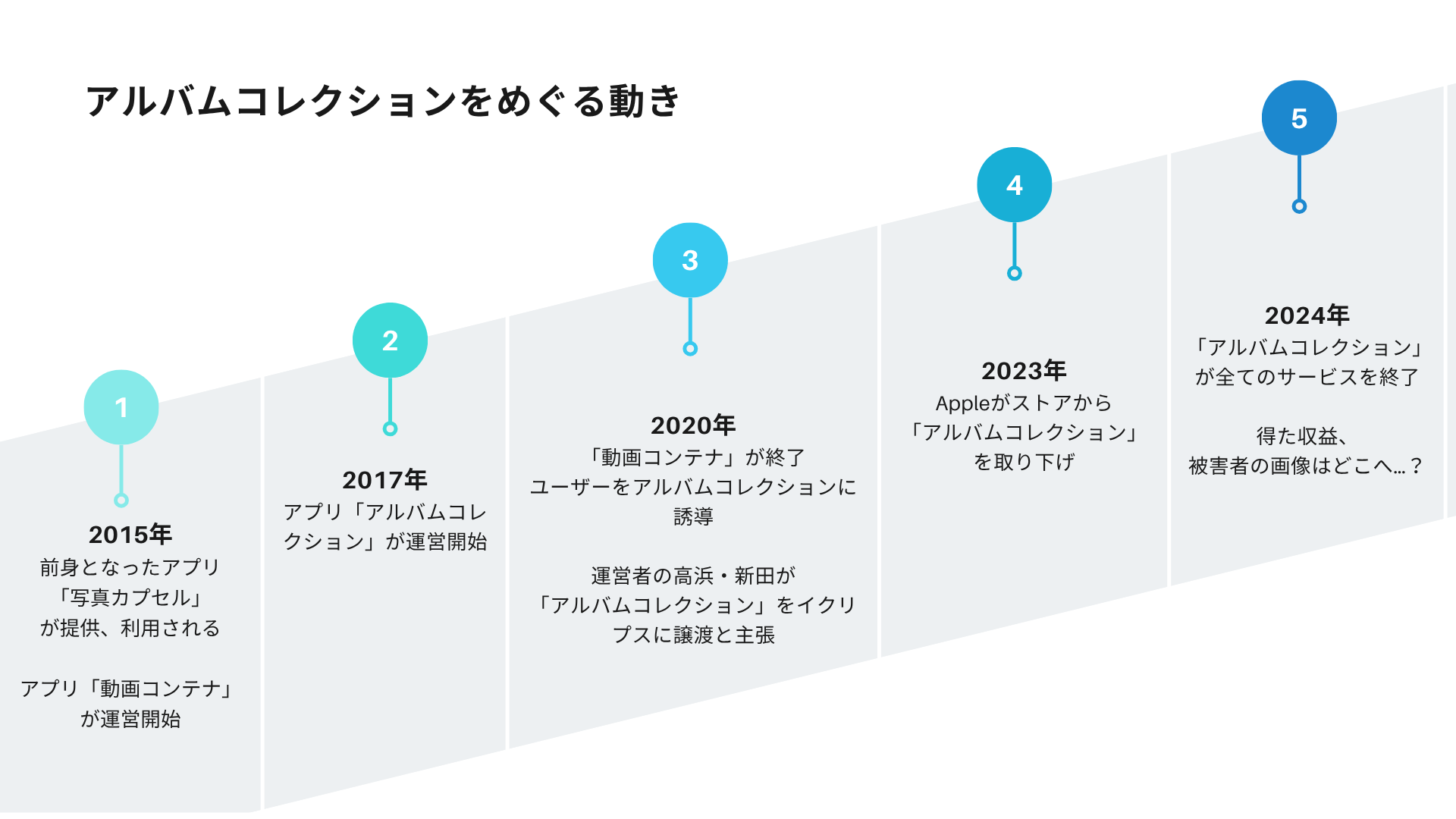 2020年までアルバムコレクションの運営を続けていたと主張する新田啓介は、2014年から2020年までの間に、同じ仕組みのアプリを複数の名前で運営していた。「写真カプセル」「動画コンテナ」、そしてアルバムコレクションだ。これら全てで、違法画像を含む性的画像の取引が行われていた。