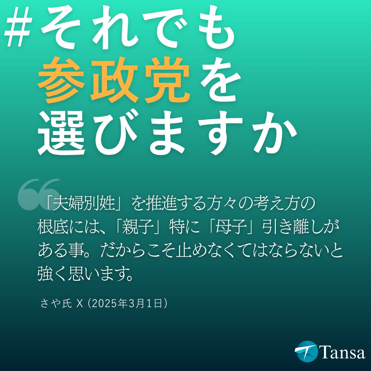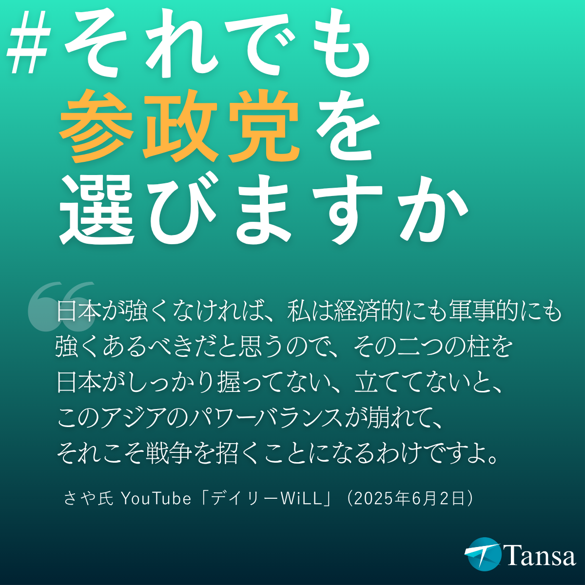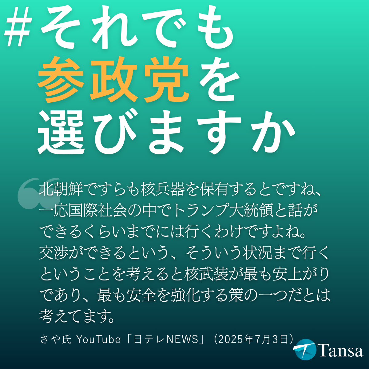 Tansaは、参院選期間中の2025年7月17日、参政党の台頭に反対する宣言を出しました。