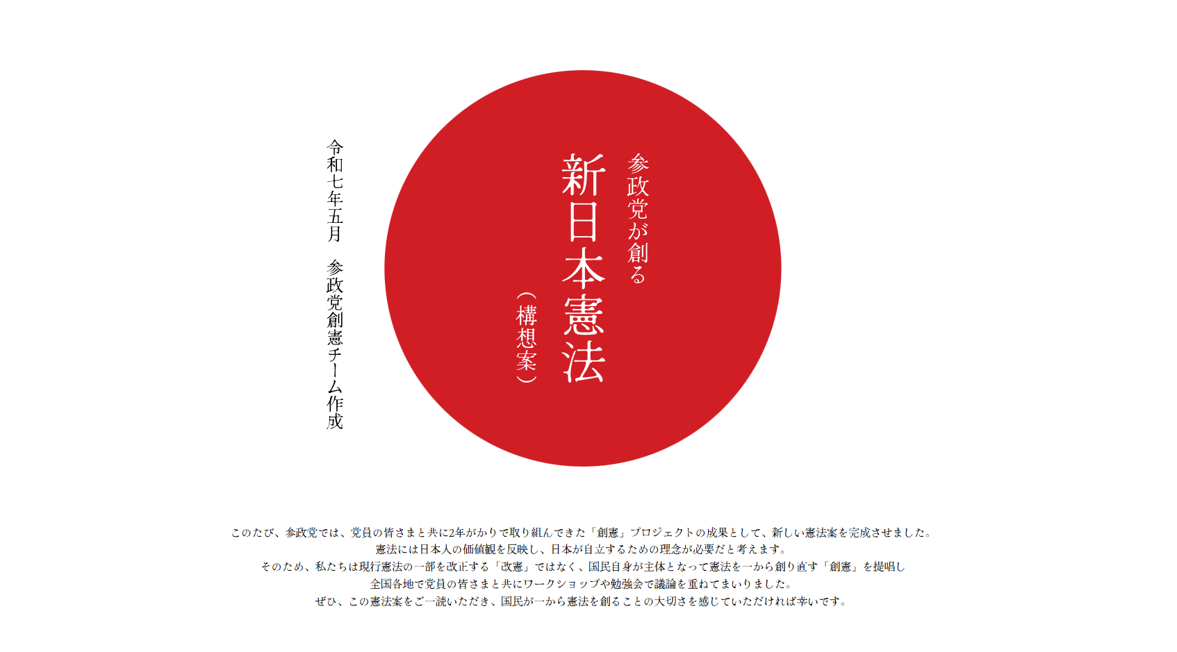 参院選を間近に控えた2025年5月、参政党は日本国憲法の「創憲案」を発表しました。党のウェブサイトによると、全国の党員と共に2年がかりで議論を重ねてきたといいます。