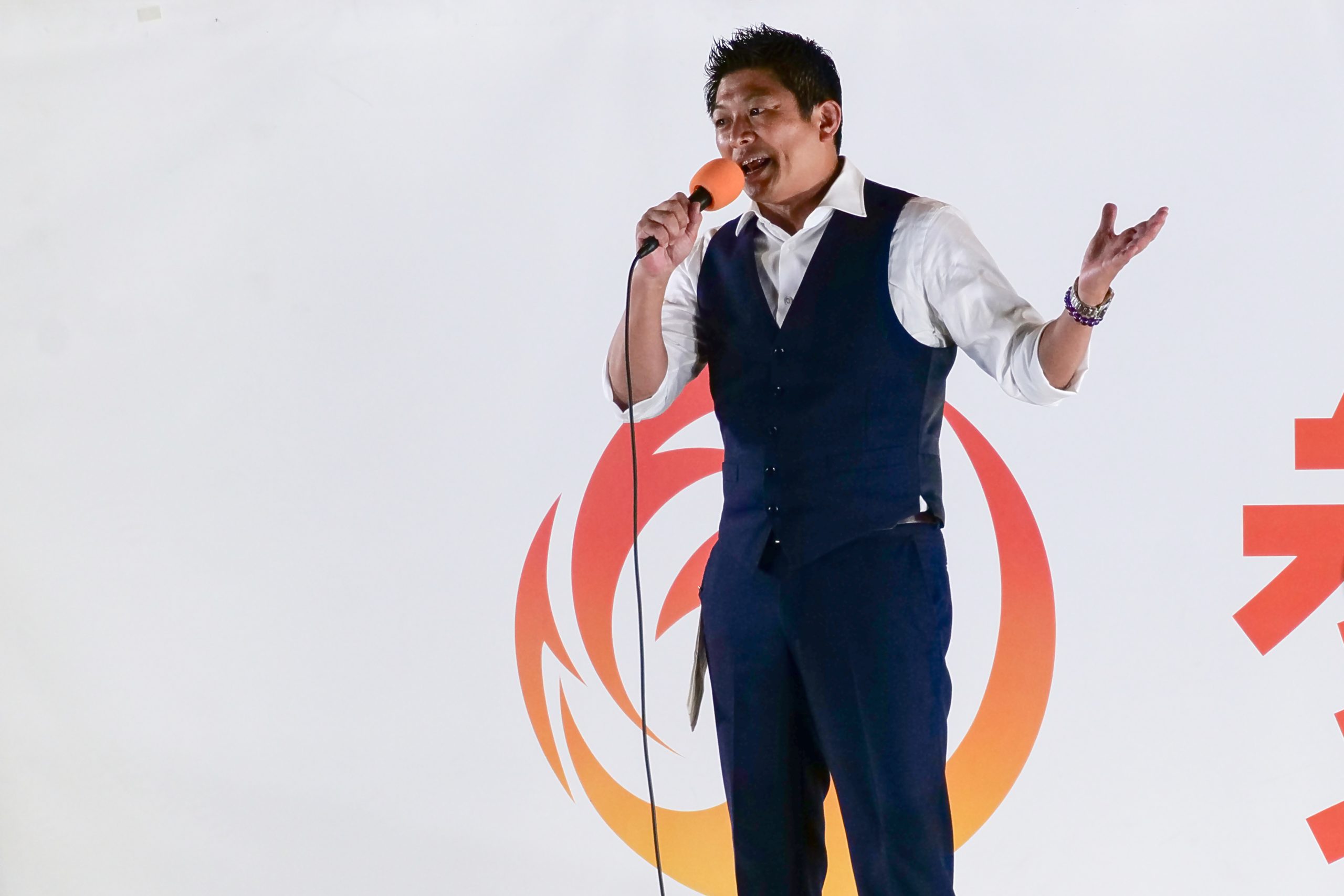 2025年参院選の最終演説会で熱弁を振るう、参政党の神谷宗幣代表=東京都港区で2025年7月19日、千金良航太郎撮影