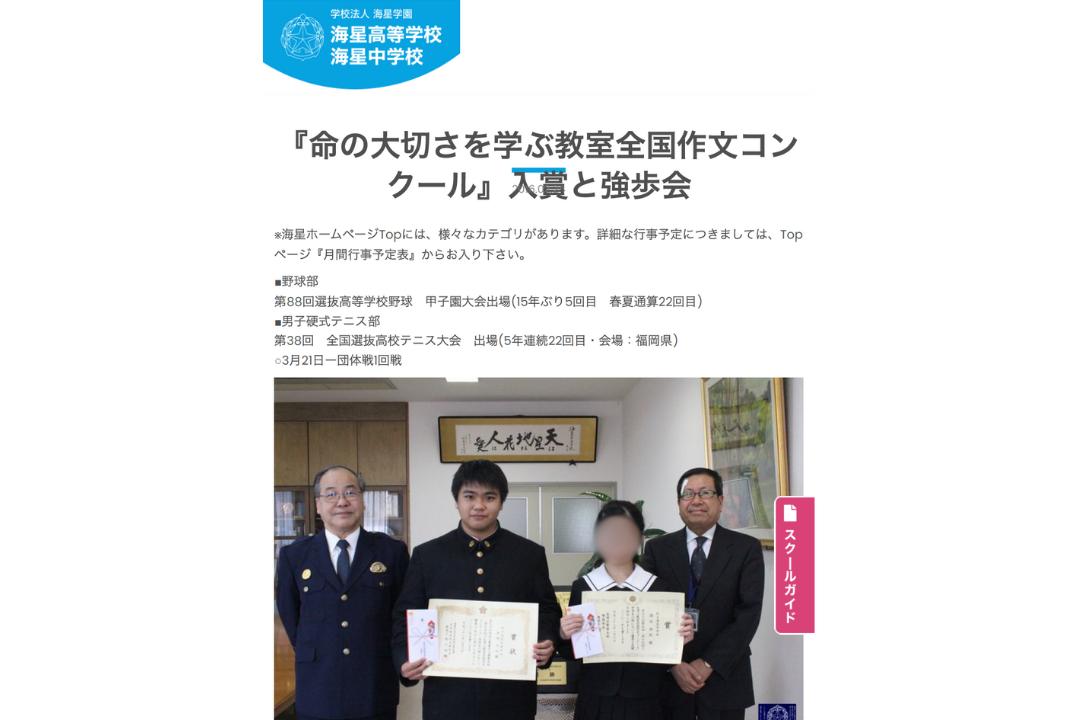 海星学園のホームページで受賞を讃えられる井村大和さん(左から2人目、画像の一部を加工しています)