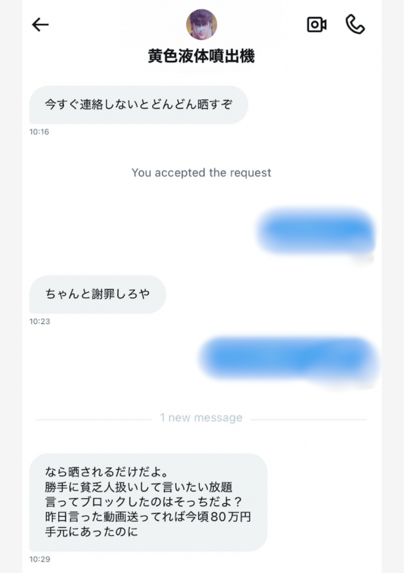 この女性は、SNSでつながった相手から、融資をするという条件で裸の動画を何本も送るよう強要されたという。だが、実際に動画を送っても金を借りることはできなかった。相手のアカウントをブロックしたところ、今度は脅迫されているという。
