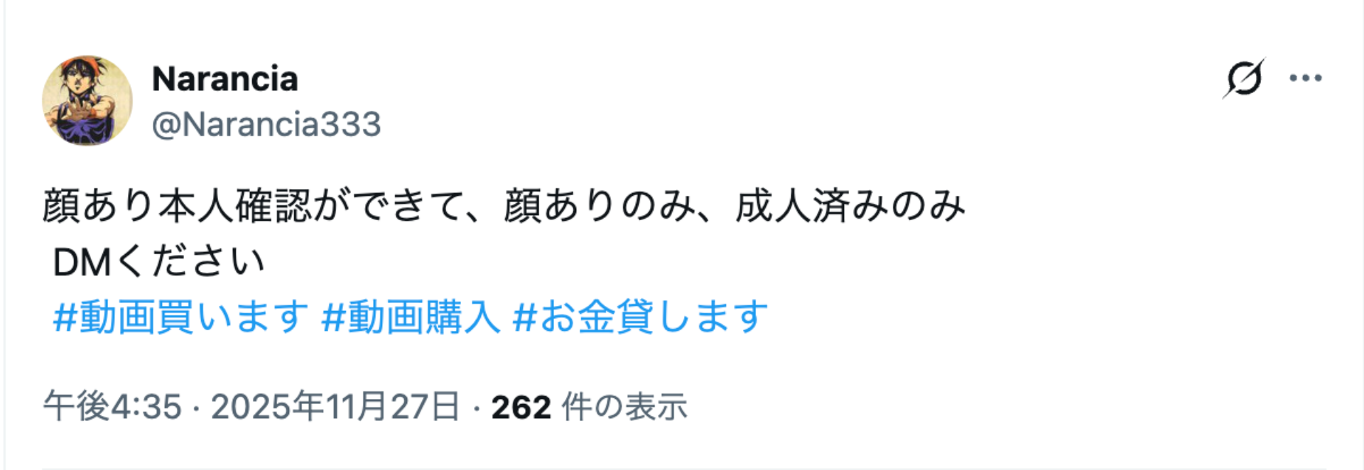 Xで融資と引き換えに性的動画を買い取ると仄めかす投稿