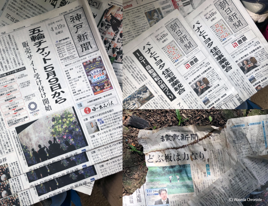 青いビニル袋で包まれた中には、古紙が巻かれている。よく見ると、日本の新聞ばかりだった。