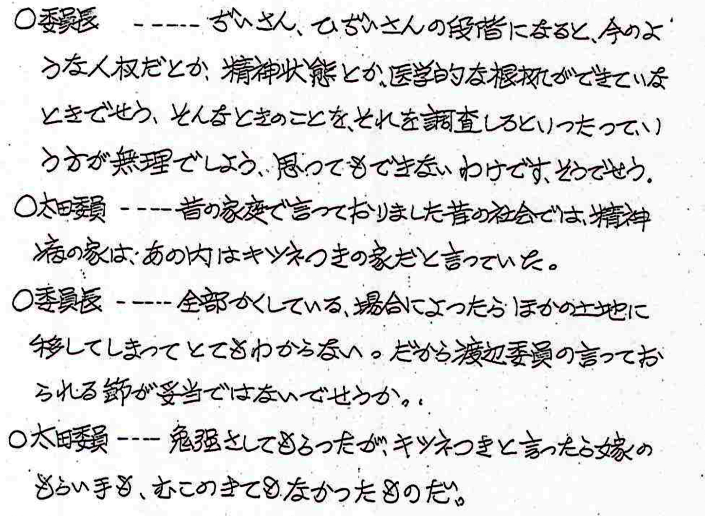 太田実太郎(県社会福祉協議会長)「昔の家庭で言っておりました昔の社会では、精神病の家は、あの内は(原文まま)キツネつきの家だと言っていた。キツネつきと言ったら嫁のもらい手も、むこのきてもなかったものだ」